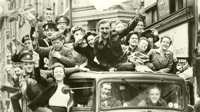 La Londra, în 8 mai 1945, sute de mii de oameni s-au adunat în fața Palatului Buckingham, iar regele George al VI-lea și familia regală au ieșit la balcon de șapte ori pentru a saluta mulțimea. Prințesele Elisabeta și Margaret au primit permisiunea să se amestece în mulțime sub anonimat. Elisabeta, viitoarea regină, a spus mai târziu că acea ieșire spontană a fost „una dintre cele mai memorabile nopți ale vieții sale”.