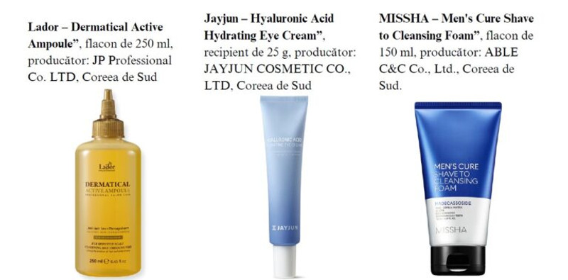 Produsele identificate ca neconforme sunt: Lador – Dermatical Active Ampoule, flacon de 250 ml, produs de JP Professional Co. LTD, Coreea de Sud; Jayjun – Hyaluronic Acid Hydrating Eye Cream, recipient de 25 g, produs de JAYJUN COSMETIC CO., LTD, Coreea de Sud; MISSHA – Men’s Cure Shave to Cleansing Foam, flacon de 150 ml, produs de ABLE C&C Co., Ltd., Coreea de Sud.